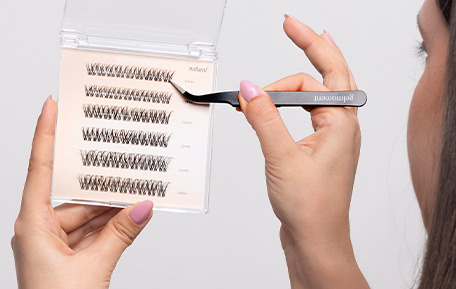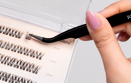 Use the tweezers to apply each cluster to the underside of the lash line (glue is on top of the one step lashes).